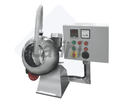 Stainless steel laboratory coating pan suitable for sugar coating, coloring, and polishing fitted with hot air blower and panel.