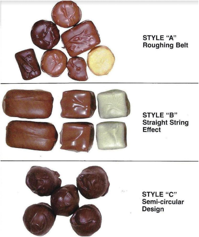 The chocolate decorator comes equipped with three styles of belts, each being perfected to decorate in accordance to the pattern desired. Changing pattern belts requires less than five minutes. To a belt, sir unsnap the Belt from the revolving cranks and install a new belt. Belts of all sizes and patterns are always carried in stock and can be ordered as the need arises. For very small pieces of chocolates, our rubber belt is recommended. This belt is made of light rubberized sheeting and works extremely well on small pieces. Chocolates of average or large size require the standard belt.